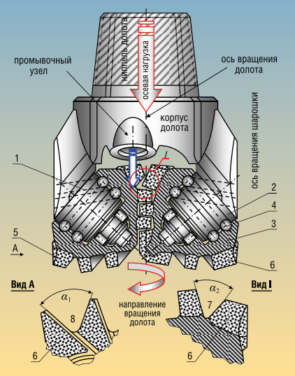 Основные конструктивные детали включают корпус, три вращающиеся шарошки с зубьями и оси, на которых они вращаются. Зубья могут быть цельными или напаянными из специальных материалов, что влияет на износостойкость и эффективность резки. Некоторые модели оборудуются твердосплавными вставками, которые значительно увеличивают срок службы долота.