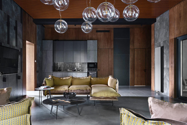 Для отделки помещений использованы панели из шпона, переходящие в скрытые высокие двери, керамогранит и декоративная фактурная штукатурка, которая cоздает красивые цветовые переходы и интересно смотрится при игре света.
